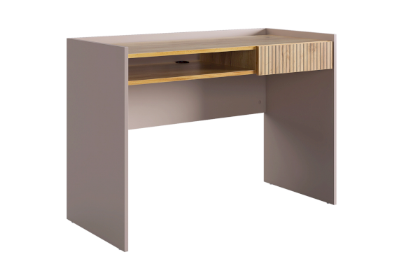 Корпус стола выполнен в цвете кашемир, что придает ему современный и спокойный вид, легко сочетающийся с любым интерьером. Выкатной ящик в цвете "дуб крафт золотой", декорирован принтом, имитирующим вертикальную фрезеровку, что добавляет столу уникальности и роскоши.